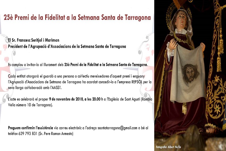 El passat divendres dia 9 de novembre , va tenir lloc el lliurament dels 25ès Premis Fidelitat Setmana Santa de Tarragona a l'església de Sant Agustí de la nostra ciutat. En aquesta edició van ser premiats els nostres companys Francesc d'Assís Nadal...